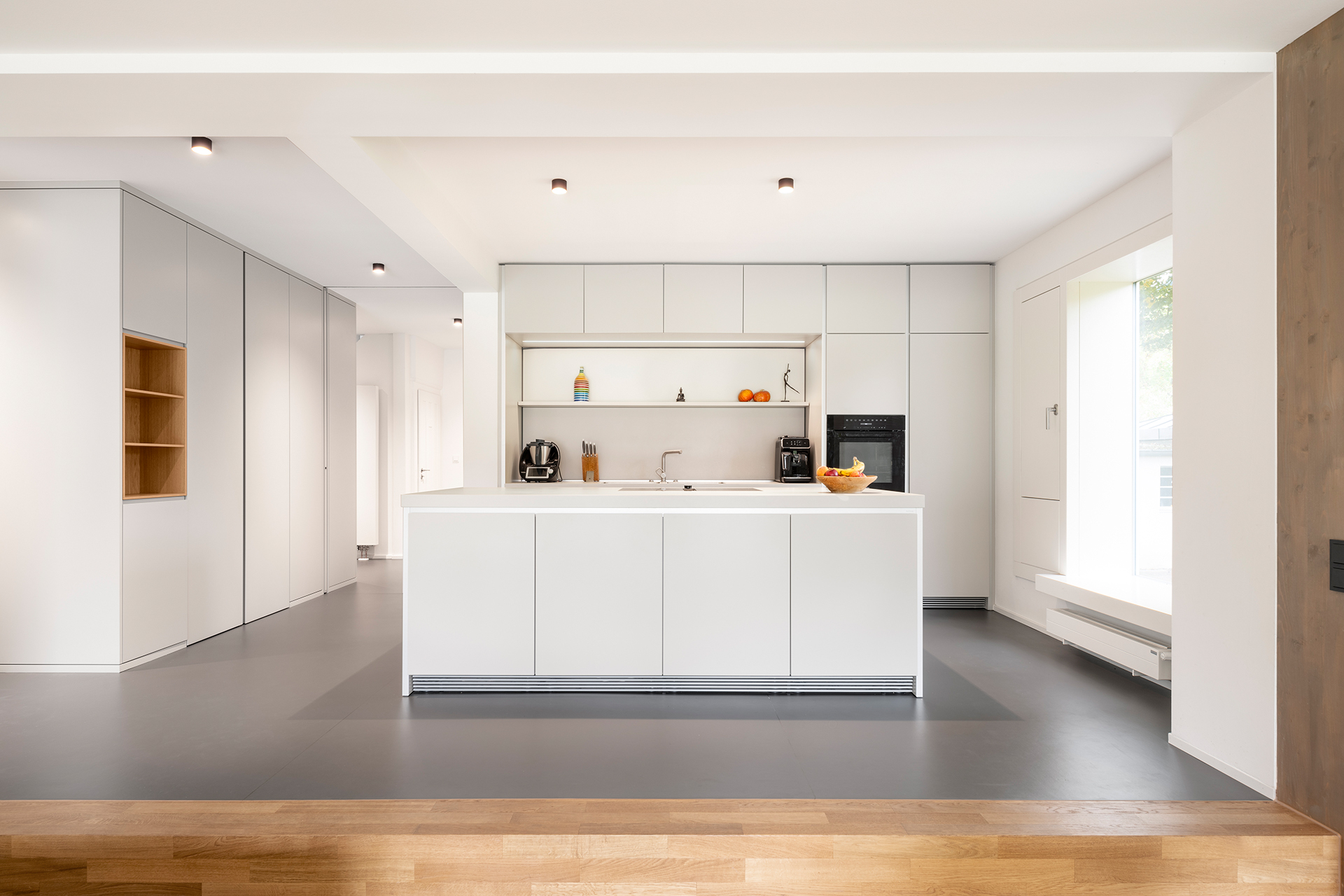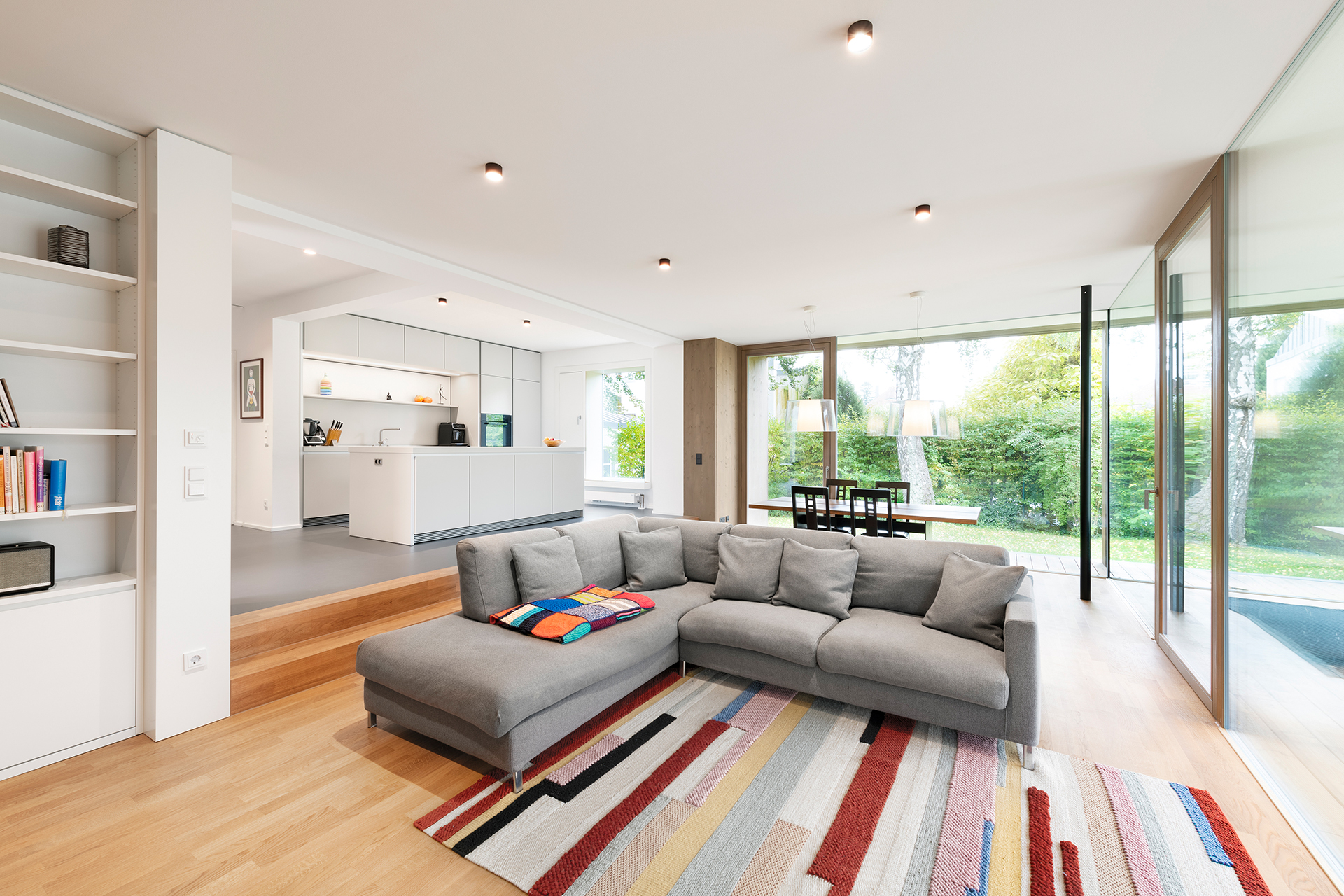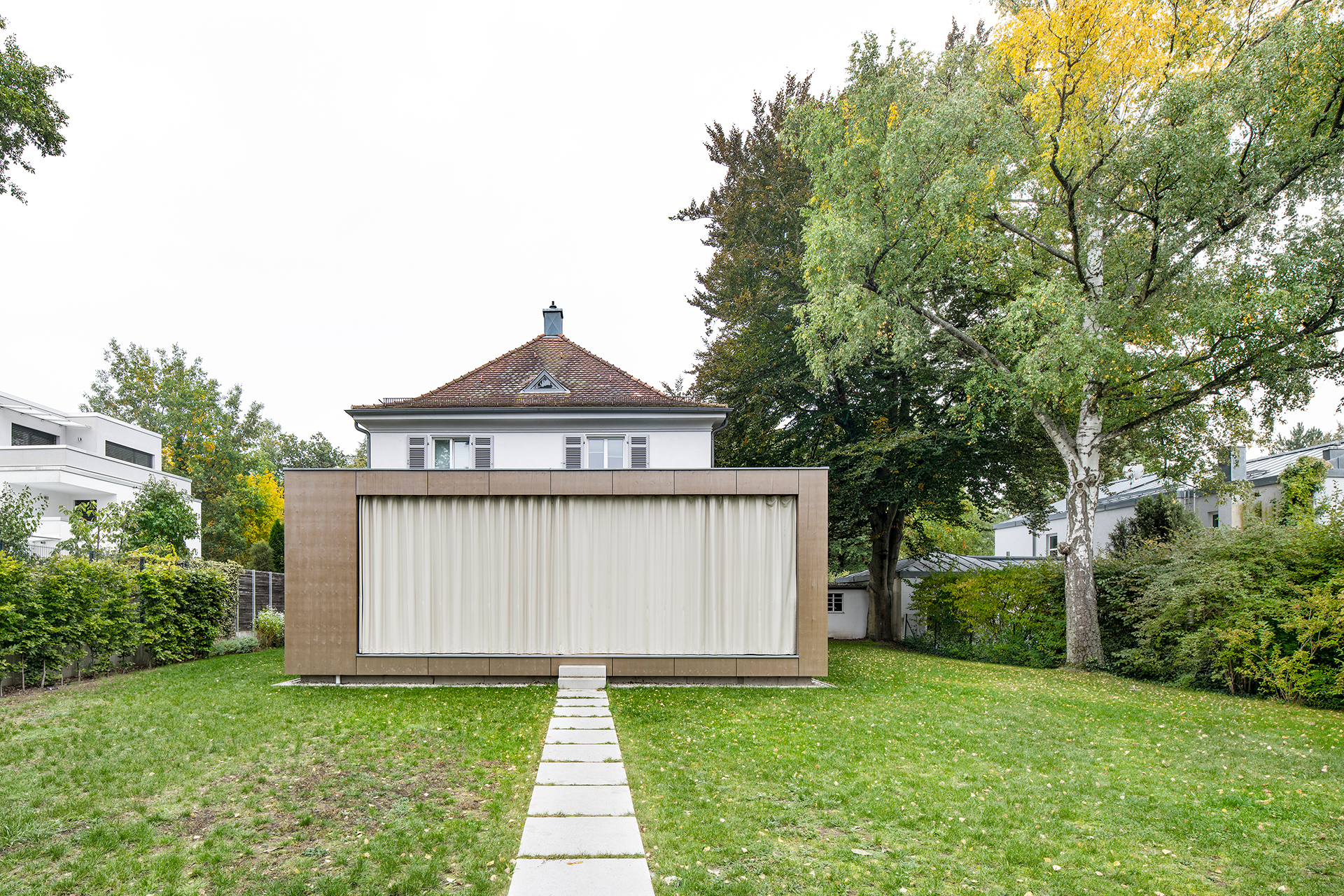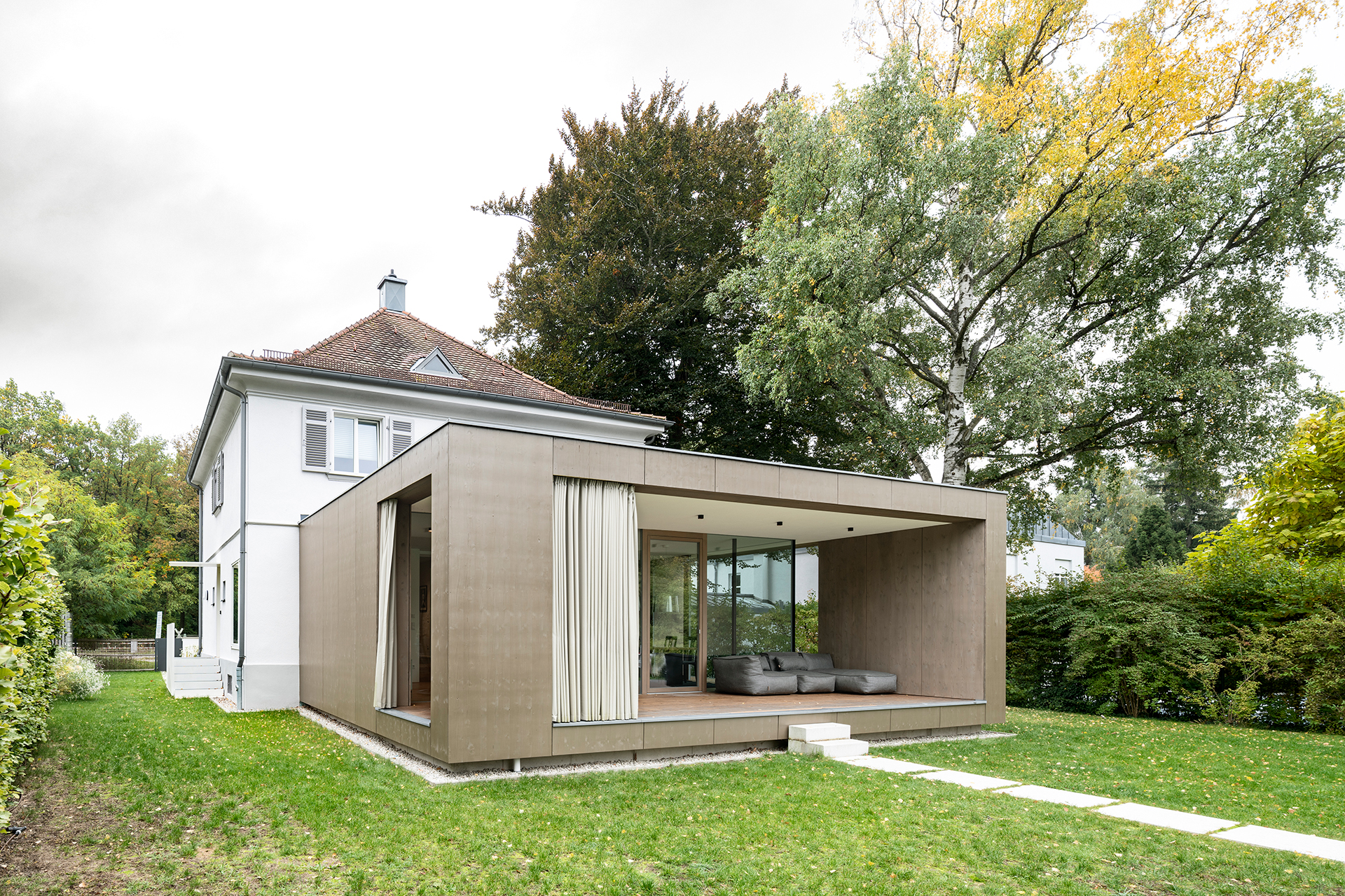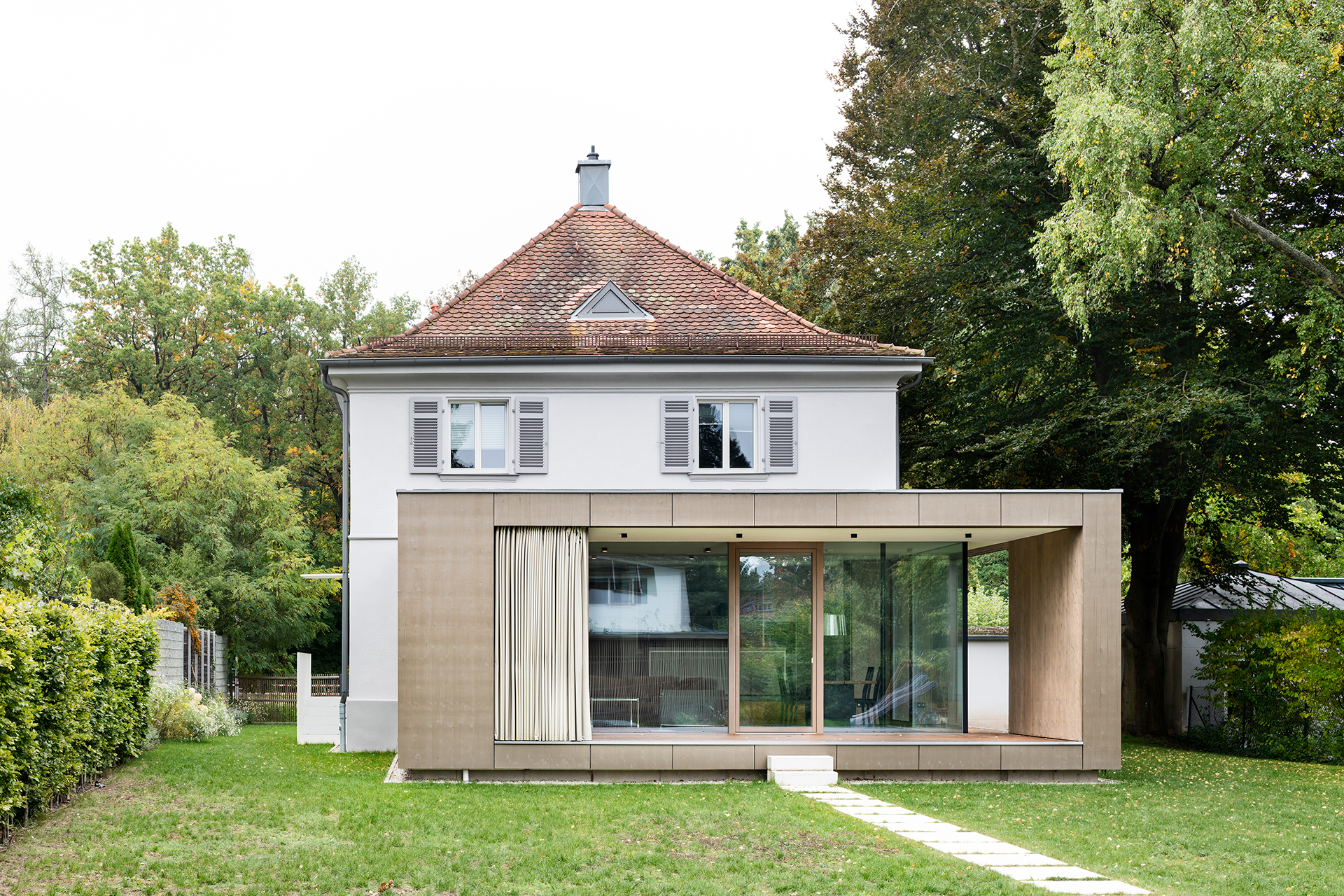 Das neue Konzept sieht den Abbruch eines baufälligen Anbaus Richtung Garten vor, um den ursprünglichen Charakter des freistehenden Solitärs zunächst wiederherzustellen. Während das Obergeschoss mit nur wenigen Handgriffen die neue gewünschte Nutzung aufnehmen kann, wird das Erdgeschoss entschieden von räumlicher Enge befreit und erhält einen neues offenes Raumkontinuum mit Eingang, Garderobe, Nebenraum und Kochbereich.Über wenige Stufen betritt man den etwas tiefer liegenden klar definierter Holzbau mit Ess- und Wohnbereich, welcher so zwischen den erheblichen Höhenunterschieden des Erdgeschosses und des Gartens vermittelt. Eine in die Kubatur des neuen Anbaus integrierte überdachte Terrasse und die großzügige Verglasung zum Wohnraum löst die Grenze zwischen Innen- und Außenraum zusätzlich auf. Der zeitgeistliche Charakter des Bestands bleibt bei den Maßnahmen allerdings bestehen, Oberflächen und Fassade werden behutsam saniert und mit wenigen modernen Elementen in die heutige Zeit übertragen.