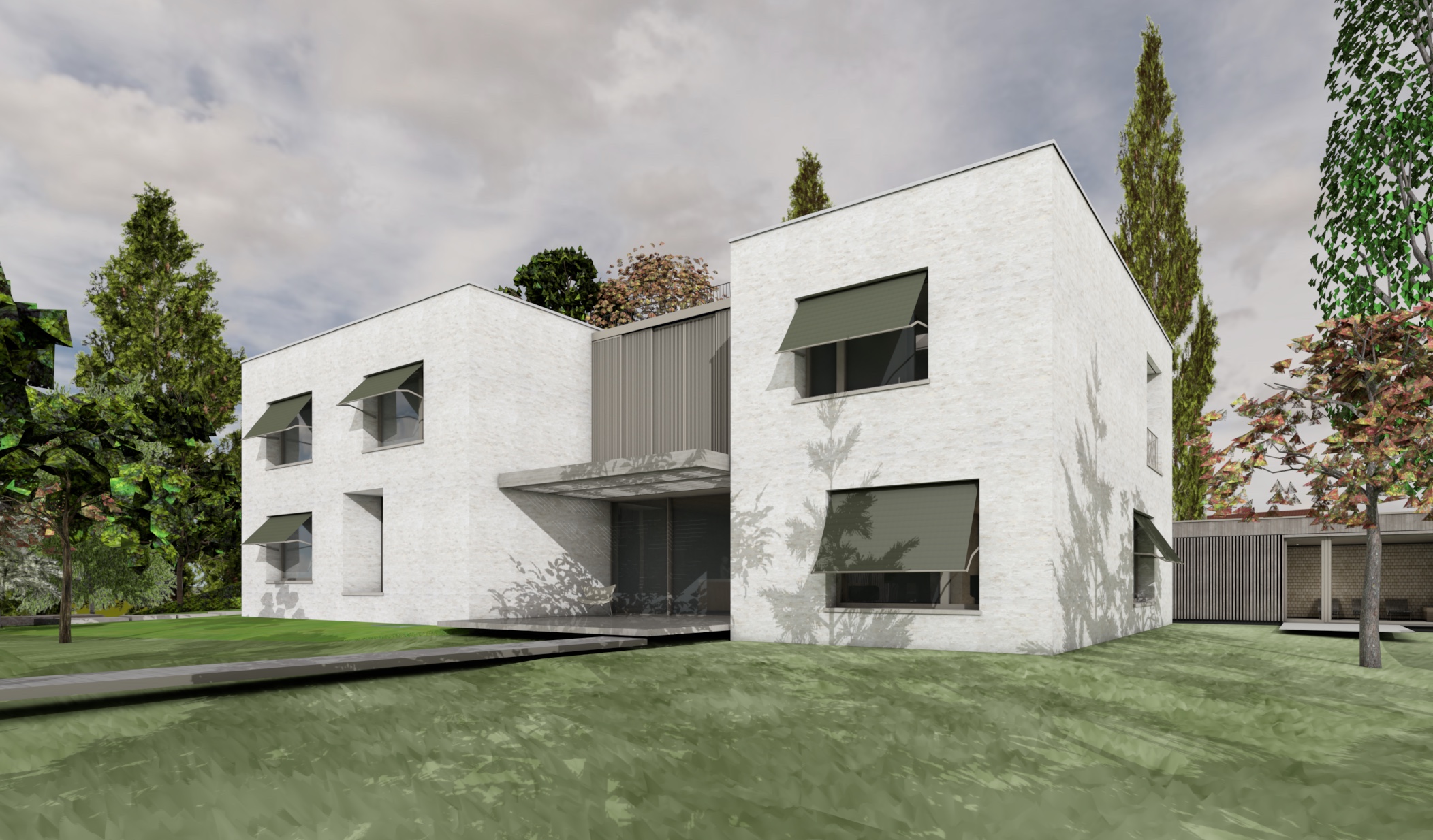 Um das relativ große Bauvolumen sensibel in die kleinteilige Umgebung einzubetten, wurde das Gebäude in drei kleinere Volumen aufgeteilt. Die 3 Baukörper sind so auf dem Grundstück platziert, dass dazwischen transparente Fugen entstehen. Diese verglasten Zwischenräume dienen als verbindende Bewegungszonen und stellen die Beziehung zur umgebenden Landschaft her.
